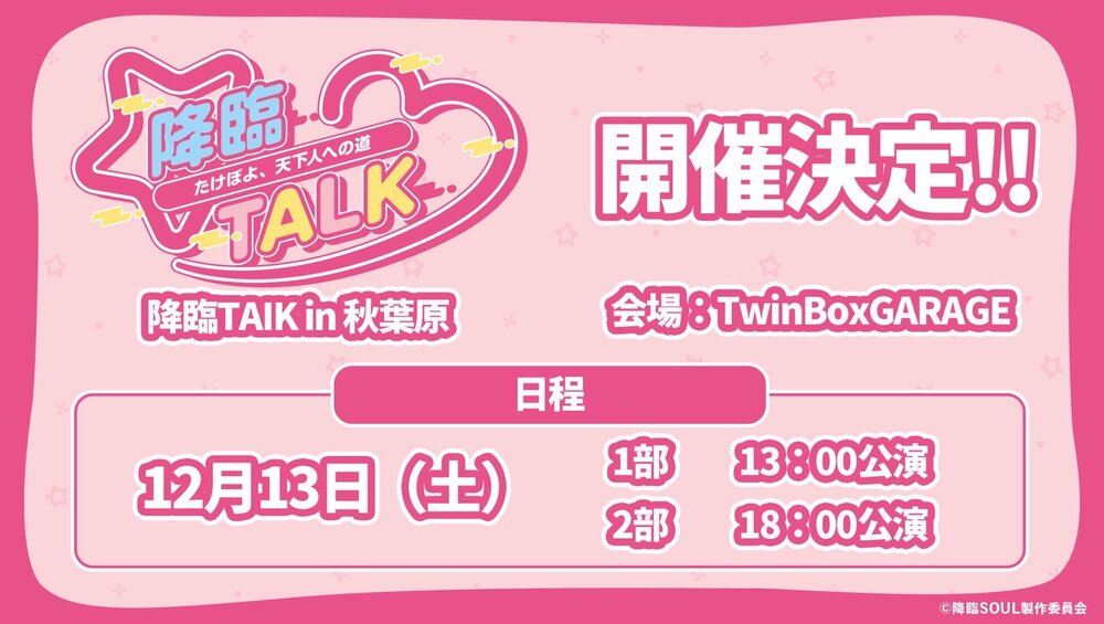 この度、『降臨TALK in 秋葉原』昼の部への出演が決定しましたのでお知らせいたします。